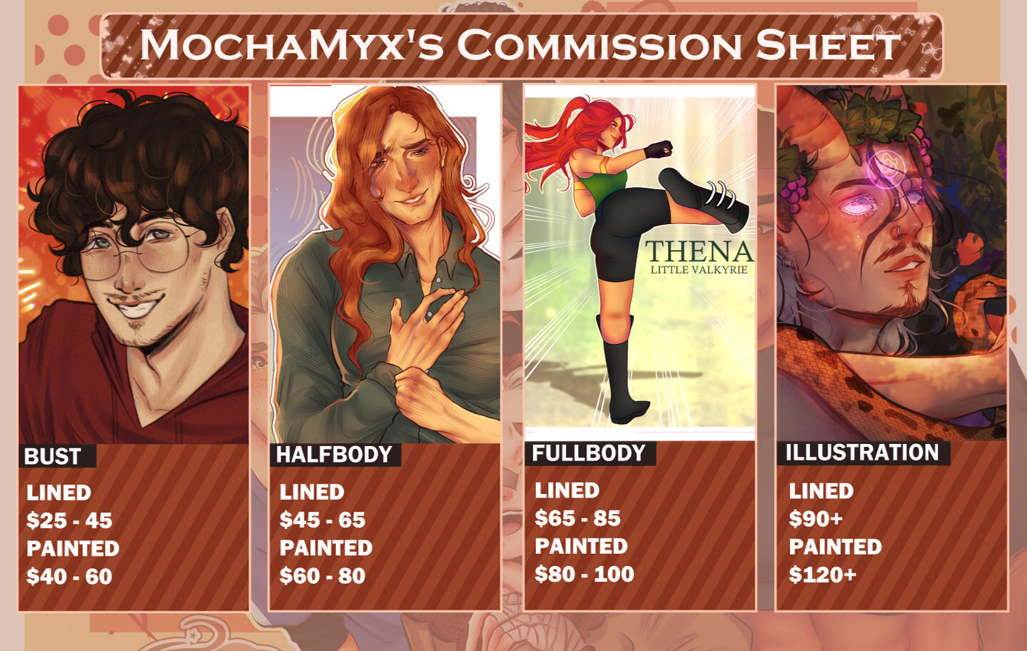 TERMS OF SERVICE MUST BE AGREED TO TO PROCEED WITH COMMISSIONING. EVERYTHING LISTED MUST BE FOLLOWED OR ELSE YOU WILL BE BLACKLISTED•Provide OC/Character reference, any important information about the character (ex: personality), and color palette. A visual reference MUST be provided. I will not draw based on description. This can be an assortment of images or a singular reference.•I do not work on a first come first serve basis; Commissions will be completed based on types, not order of commissioning. The estimated completion time is an ESTIMATION based on the type of commission. These may vary depending on the commission queue time as well as emergency events which you will be informed of if ocurring.•I have the right to decline any commission that I wish not to work on. This may be due to topics I feel uncomfortable working with or due to behavior exhibited by buyer or for any other reason.•All payment must be made in full up front within 3 days of a request being accepted. DO NOT SEND PAYMENT UNLESS REQUEST IS ACCEPTED. I AM NOT RESPONSIBLE FOR PAYMENT SENT WITHOUT ACCEPTED REQUEST.•If you have a specific due date, YOU MUST LET ME KNOW AHEAD OF TIME (A WEEK MINIMUM). I am not responsible for due dates if you do not inform me of them. If I am told later about a due date, I reserve the right to cancel the commission or continue to work on the commission for an additional fee for a rushed commission depending on how soon the due date is.•You will be provided two WIP images with watermarks. Two chances to change an aspect within the drawing will be provided. Once during the sketching process and once during the coloring process. If you wish nothing to be changed, this does not apply.•Any ill behavior will not be tolerated and your commission will be canceled if it occurs. No refund will be provided and you will be blacklisted from commissioning from me.•All payments will be processed through Paypal only through invoice or VGen Services.•You are allowed to claim the character as your own if it is your OC and post the art with credit to me but CANNOT claim the art is yours.•Failure to credit my work to me after a warning will cause you to be blacklisted from commissioning me further. All rights to the artwork will be reclaimed and you will NOT be allowed to repost the artwork at all.•I own the piece so I may post it on social media with a watermark, use for a portfolio, and promote myself with the piece.•Commissions are intended for NON-COMMERCIAL USE ONLY. If the commission is to be used for commercial purposes, an additional fee depending on the piece being drawn will be added to the final price.•Refunds are only accepted within 24 hours. After 24 hours, no refunds will be given.• Artwork made by MochaMyx is in no way allowed to be used in AI. By commissioning me, you agree to never use my art to train AI, to be modified by AI, or be submitted to AI or stored in AI databases. This includes ChatGPT, Sora AI, Character AI, Grok, and any other AI models.
